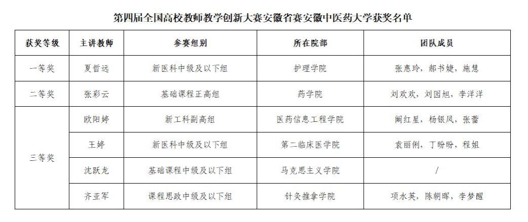 4月21日,第四届全国高校教师教学创新大赛安徽省决赛在蚌埠市落下帷幕,我校参赛教师再获佳绩。其中以夏哲远为主讲教师的《中医临床护理学》团队荣获新医科中级及以下组一等奖,张彩云为主讲教师的团队获得大赛二等奖,欧阳婷、王婷、沈跃龙、齐亚军为主讲教师的团队分别获得大赛三等奖。