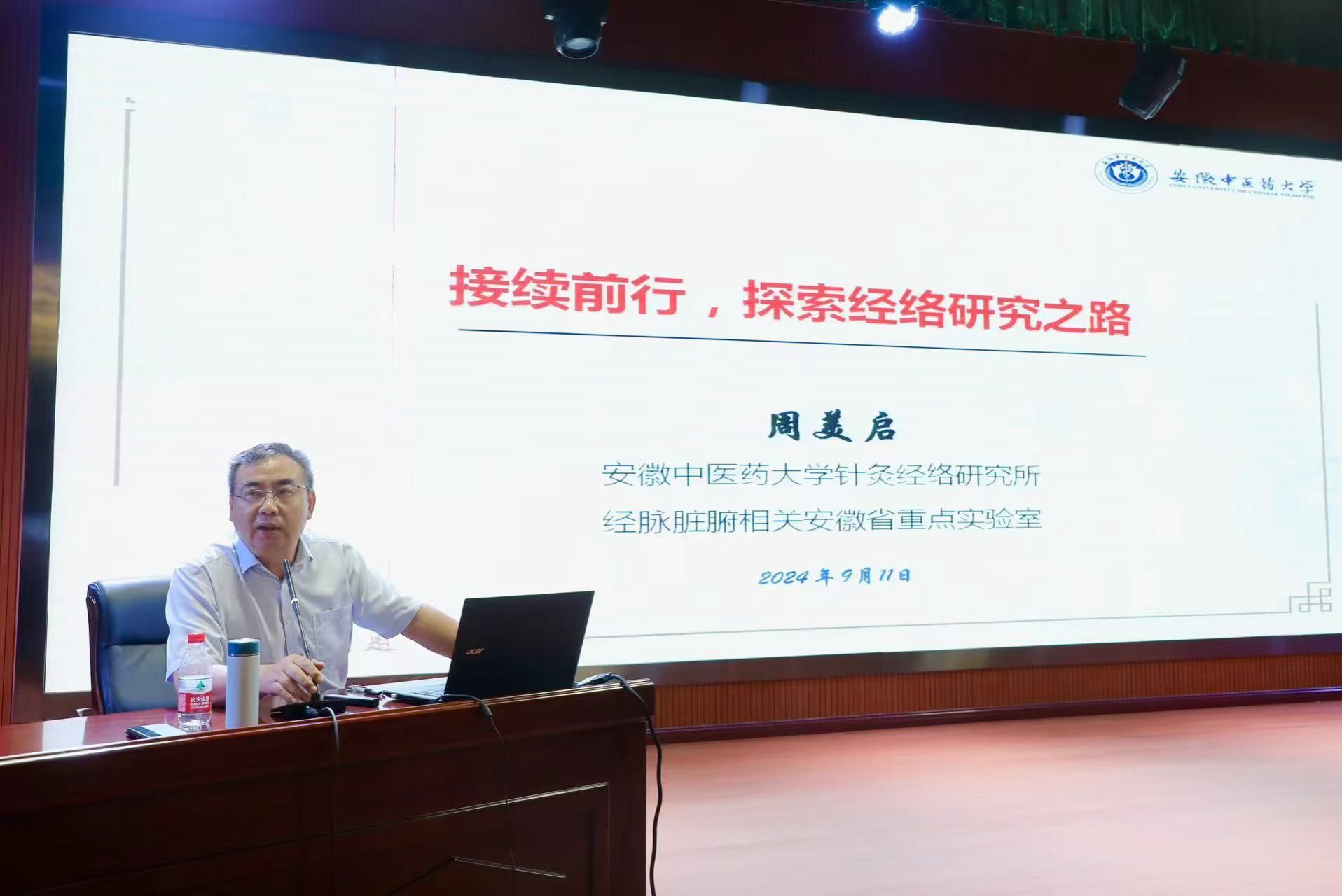 9月11日,学校在图书馆一楼报告厅举办“少荃湖论坛”第三场报告会,本次报告会邀请了享受国务院政府特殊津贴专家,安徽省学术和技术带头人,安徽省优秀科技工作者,安徽省中医药领军人才周美启教授作题为“接续前行,探索经络研究之路”的学术经验报告。